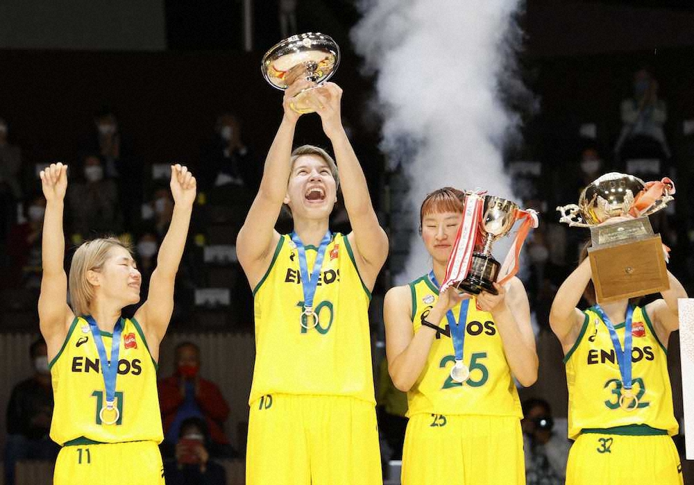優勝の瞬間、渡嘉敷は涙を流してチームメートと抱き合った。16日の富士通戦で右膝前十字じん帯を断裂。東京五輪の出場が絶望的となる大けがのショックを見せず、ベンチから大声で指示を出してチームを鼓舞し続けた。前回大会MVPがコート外でも存在感を発揮。梅崎ヘッドコーチは「ベンチには渡嘉敷ヘッドコーチがいた。皆がその指示をよく聞いてくれた」と冗談交じりに称えた。