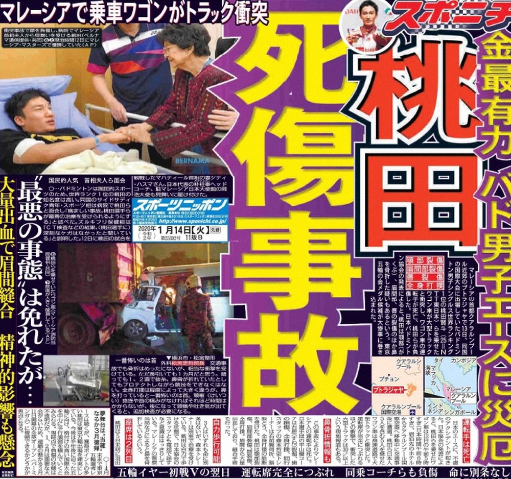 ▽1月13日 クアラルンプール国際空港に移動中のワゴン車が高速道路で大型トラックと衝突。2列目に乗っていた桃田は顎部、眉間部、唇の裂傷と全身打撲と診断。大量出血した眉間は現地の病院で縫合手術。マハティール首相の妻シティ・ハスマさんらも見舞いに駆け付けた。