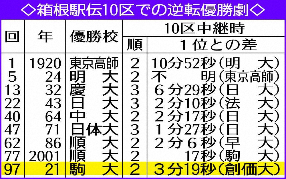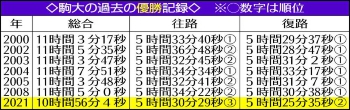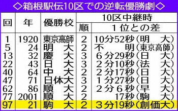 箱根駅伝で総合優勝のゴールテープを切る駒大・石川(撮影・尾崎 有希) Photo by スポニチ 215キロ目のドラマ!駒大13年ぶり7度目V 戦後最大3分19秒差の最終10区大… ギャラリーで見る この記事のフォト 2021年01月04日の画像一覧 もっと見る 2021年01月04日の画像をもっと見る