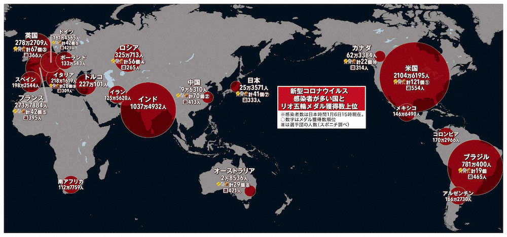 東京五輪・パラリンピックへのカウントダウンとは反比例するように、国内で報告された新型コロナ感染者は初の5000人台を飛び越え、6000人を超えた。東京は昨年12月31日の1337人を更新する過去最多の1591人。再発令される緊急事態宣言の対象となる3県では千葉、埼玉も過去最多人数となった。