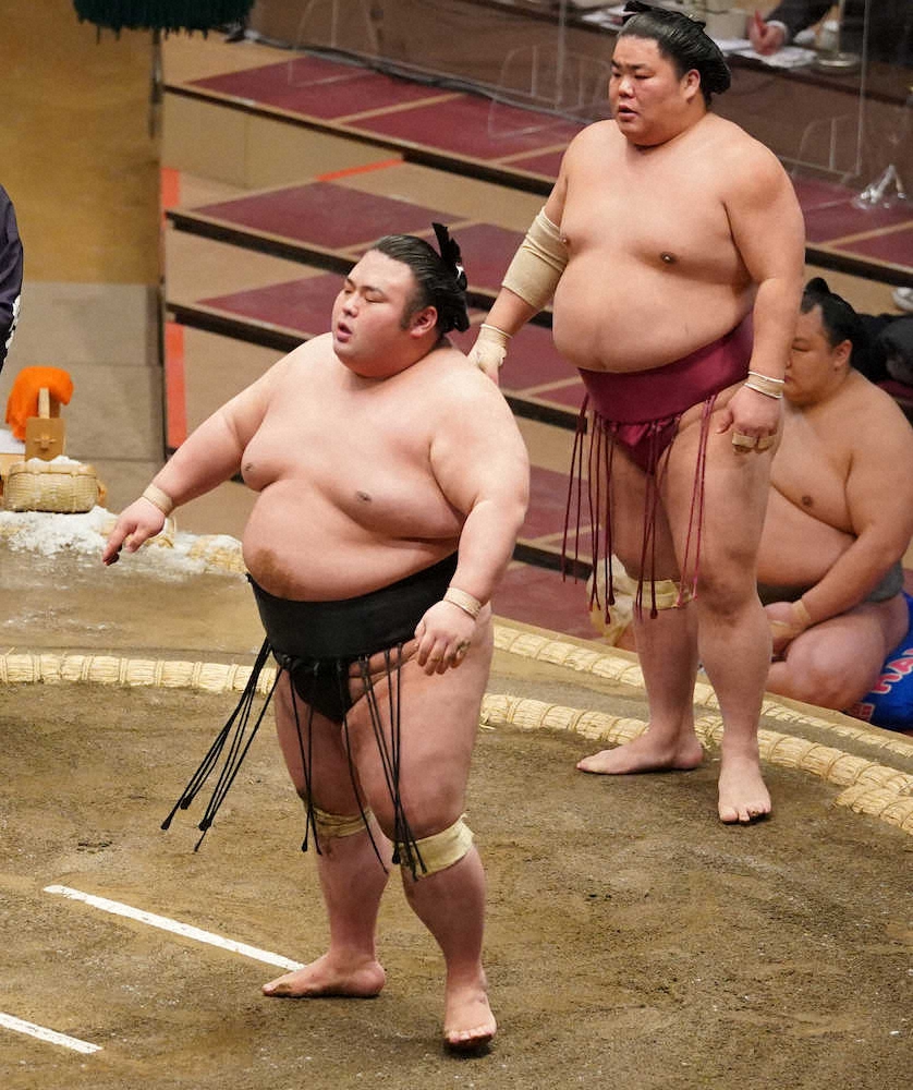 カド番大関の朝乃山は北勝富士をすくい投げで下して初白星。同じくカド番大関の正代は結びの一番で高安を寄り倒して連勝を飾った。