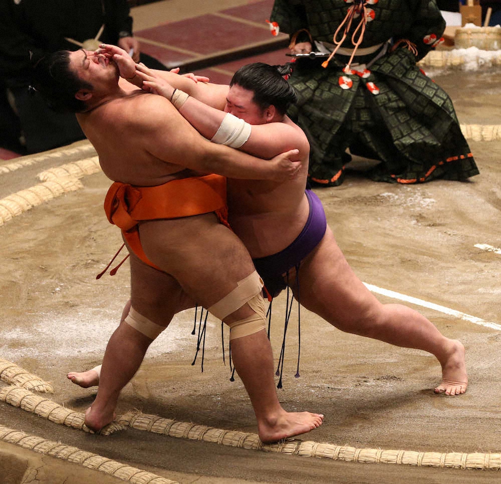 志摩ノ海を押し出しで破る明生(右)(撮影・西海健太郎)