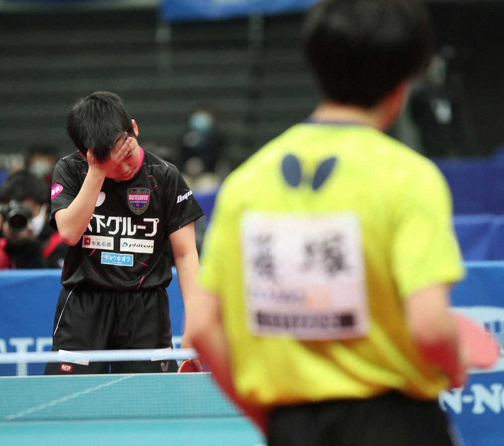 男子ジュニア準々決勝で、この種目の最年少優勝を狙った中学1年の松島輝空(そら、13=エリートアカデミー)が、篠塚大登(愛知・愛工大名電高2年)に2―3(5―11、11―8、11―7、7―11、4―11)で敗れた。試合後は号泣。タオルで顔を何度も拭き、ベンチからなかなか立ち上がれなかった。