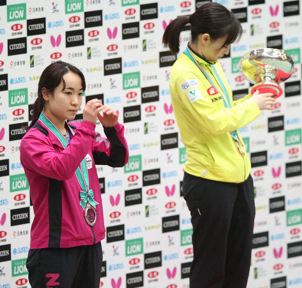 <全日本卓球選手権 女子シングルス決勝>皇后杯を手にする石川佳純(右)の横で悔し気な表情を浮かべる伊藤美誠(撮影・北條 貴史)