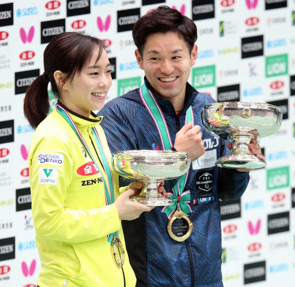 <全日本卓球選手権 女子シングルス決勝>皇后杯を手に笑顔の石川佳純。右は男子シングルス優勝の及川瑞基(撮影・北條 貴史)