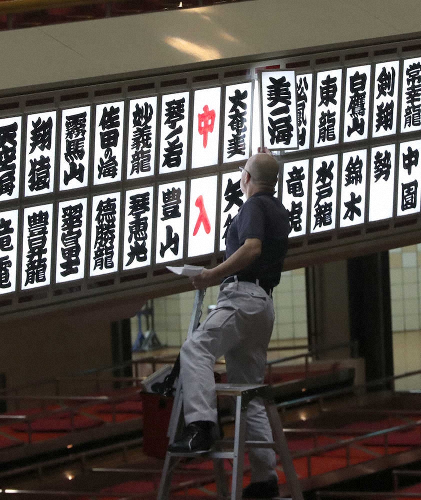 美ノ海の休場でボードを入れ替える関係者(撮影・郡司 修)