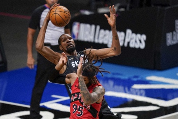 今季リーグ2位の30・8得点を記録していたネッツのケビン・デュラント(32)は試合直前に新型コロナウイルス感染者との接触確認作業が必要となったために、第1Q7分47秒からコートに登場。2007年のデビュー以来、レギュラーシーズンとプレーオフを併せて通算1006試合目で初めて途中出場となった。しかも第3Qの2分54秒、再び出場が認められなくなってロッカールームへ。結局出場19分で8得点に終わり、2017年2月28日のウィザーズ戦で無得点(開始90秒で左膝を故障)に終わって以来続いていた2ケタ得点の連続記録は「166試合」でストップした。