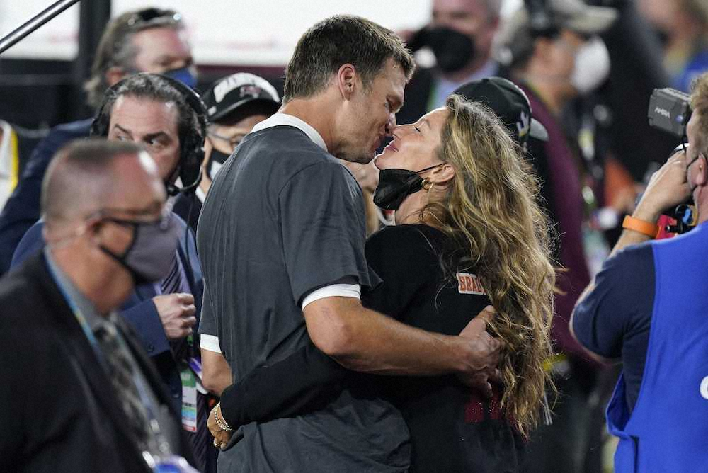 ジゼル夫人と抱擁をかわすバッカニアーズのブレイディー(AP)
