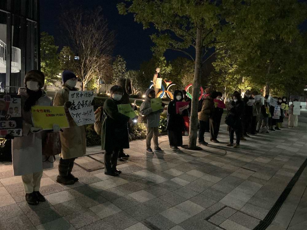 東京五輪・パラリンピック大会組織委員会の森喜朗会長(83)による女性蔑視発言に対し、日本オリンピック委員会(JOC)の入る東京・新宿区のビル「ジャパン・スポーツ・オリンピック・スクエア」の前で抗議集会が9日夜に行われた。