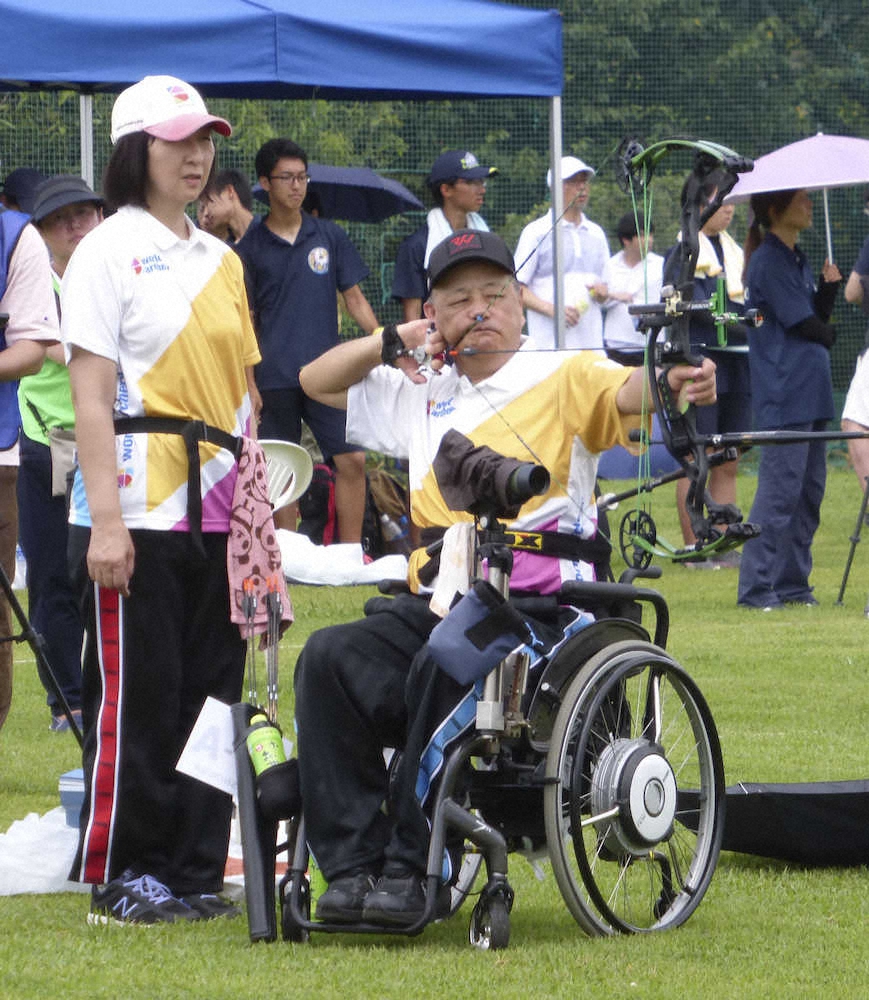 パラアーチェリーの大会でプレーする仲喜嗣さん。左は見守る妻の奈生美さん