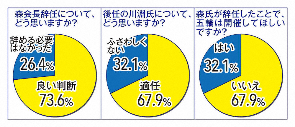 スポーツニッポン新聞社では、森氏の辞任表明について緊急アンケートを行った。ウェブサイト、スポニチアネックスに寄せられた回答によると、辞任を「良い判断」とする人は73・6%、「辞める必要がなかった」とする人は26・4%だった。後任の川淵氏については「適任」が67・9%、「ふさわしくない」が32・1%で7割近い人が評価した。