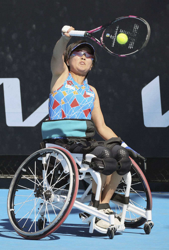 車いすの部女子シングルス1回戦でストレート勝ちし、4強入りを決めた大谷(共同)