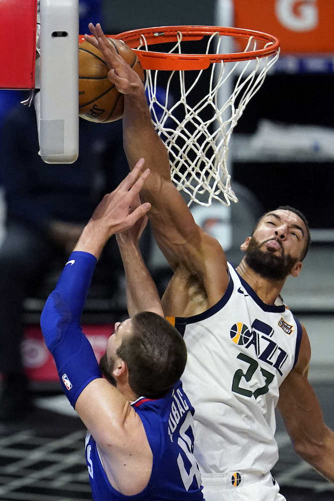 クリッパーズ・ズバッツのシュートをブロックするジャズのゴベア(AP)