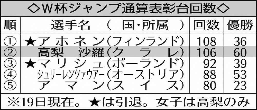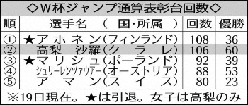 ジャンプ女子個人第9戦を制し今季3勝目を挙げ、歴代最多の通算勝利数を60に伸ばした高梨(AP) Photo by AP 沙羅 最多更新W杯通算60勝、アホネンの表彰台歴代トップもあと2 ギャラリーで見る この記事のフォト 2021年02月20日の画像一覧 もっと見る 2021年02月20日の画像をもっと見る