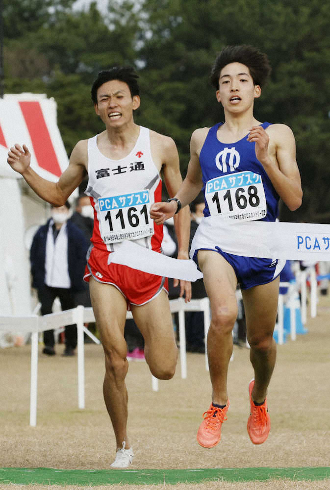 男子はスーパー1年生の三浦が大物ぶりを発揮した。実業団の実力者、松枝にラストスパートで競り勝った。タイム差なしの大接戦ながら、走りも表情も余裕を感じさせた。「最後はかわされると思ったが、力を振り絞れた」と振り返った。