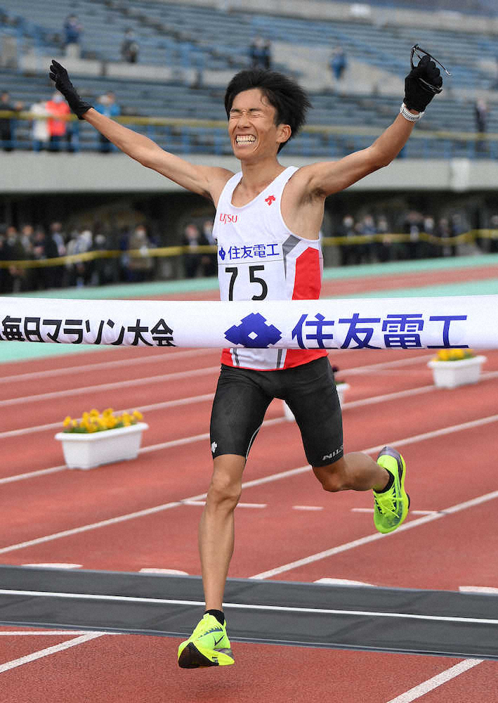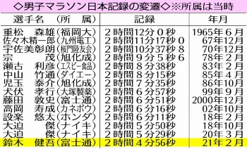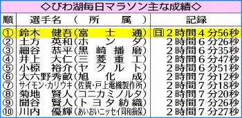 今大会を最後に滋賀での開催を終えるラストレースで日本人初の2時間4分台が誕生した。フルマラソン5度目の鈴木健吾(25=富士通)が2時間4分56秒の日本新記録で初優勝した。コロナ下で海外招待選手がいない中、36キロ付近の給水所でスパート。終盤も1キロ2分50秒前後のハイペースで走りきり、大迫傑(29=ナイキ)が20年東京マラソンでマークした2時間5分29秒を33秒も更新。24年パリ五輪の有力候補に名乗りを上げた。