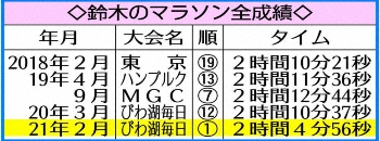 ◆鈴木 健吾(すずき・けんご)1995年(平7)6月11日生まれ、愛媛県宇和島市出身の25歳。小学6年の時に父親の勧めで陸上を始め、宇和島東高から神奈川大に進学。神奈川大3年の17年に東京箱根間往復大学駅伝2区で区間賞。これまでのマラソン自己ベストは18年東京でマークした2時間10分21秒。好きな食べ物は焼き肉と寿司。1メートル63、48キロ。