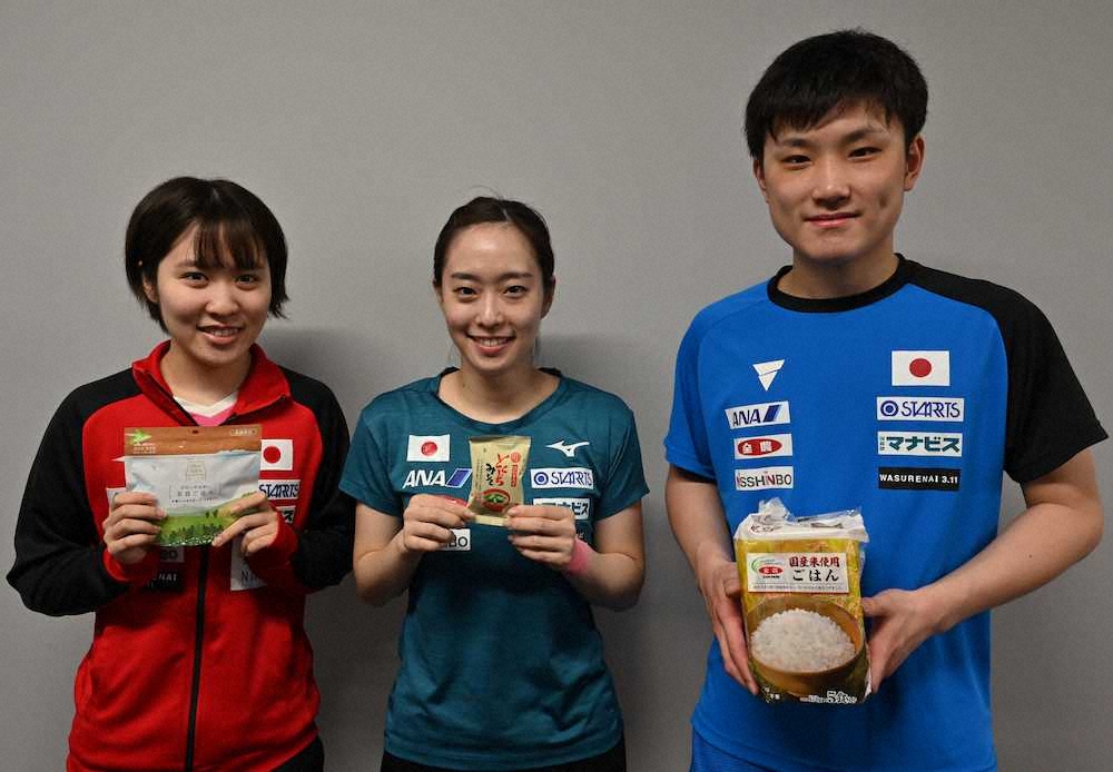 全農からの「ニッポンの食」を手に笑顔の(左から)平野美宇、石川佳純、張本智和