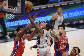 NBAウィザーズは12日、地元ワシントンDCで東地区全体首位の76ersと対戦。一度もリードできないままに101―127(前半53―63)で敗れて今季の成績は14勝22敗となった。得点部門1位(32・5)で球宴で先発したブラドリー・ビール(27)の得点は今季2番目に少ない19得点に終わり、チームはここ5戦で4敗目。このカードは今季3戦全敗で球宴明けの後半戦2試合は、112―127で敗れたグリズリーズ戦(10日)に続き、いずれも2ケタ点差での敗戦となった。