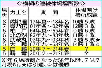 年6場所となった1958年以降、36歳を過ぎて土俵に上がった横綱は37歳で引退した吉葉山と白鵬のみ。幕内在位は100場所目を迎え、横綱在位は81場所。体力の衰えとともにケガの回復も遅くなることは否めない。師匠は「今場所はどうしても出ないといけないと思ってやった結果。本人が一番悔しい。手術をして再起を懸ける」と代弁したが、入門して20年の第一人者に最大の危機が訪れた。