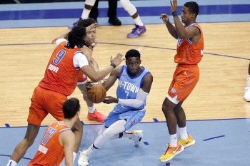 得点部門1位(32・5)のブラドリー・ビール(27)はネッツのきびしいマークにあって17得点どまり。ラッセル・ウエストブルック(32)は29得点、13リバウンド、13アシストで今季14回目のトリプルダブルを達成したがターンオーバーも8回を数えた。シーズン途中でラプターズから加入したセンターのアレックス・レン(27)は今季自己最多の20得点。チームのFG成功率(53・2%)はネッツ(48・9%)を上回っていたが19回のターンオーバーから27点を失うなど(ネッツは7回で7失点)、ミスの多さが試合の勝敗に影響を与える結果となった。