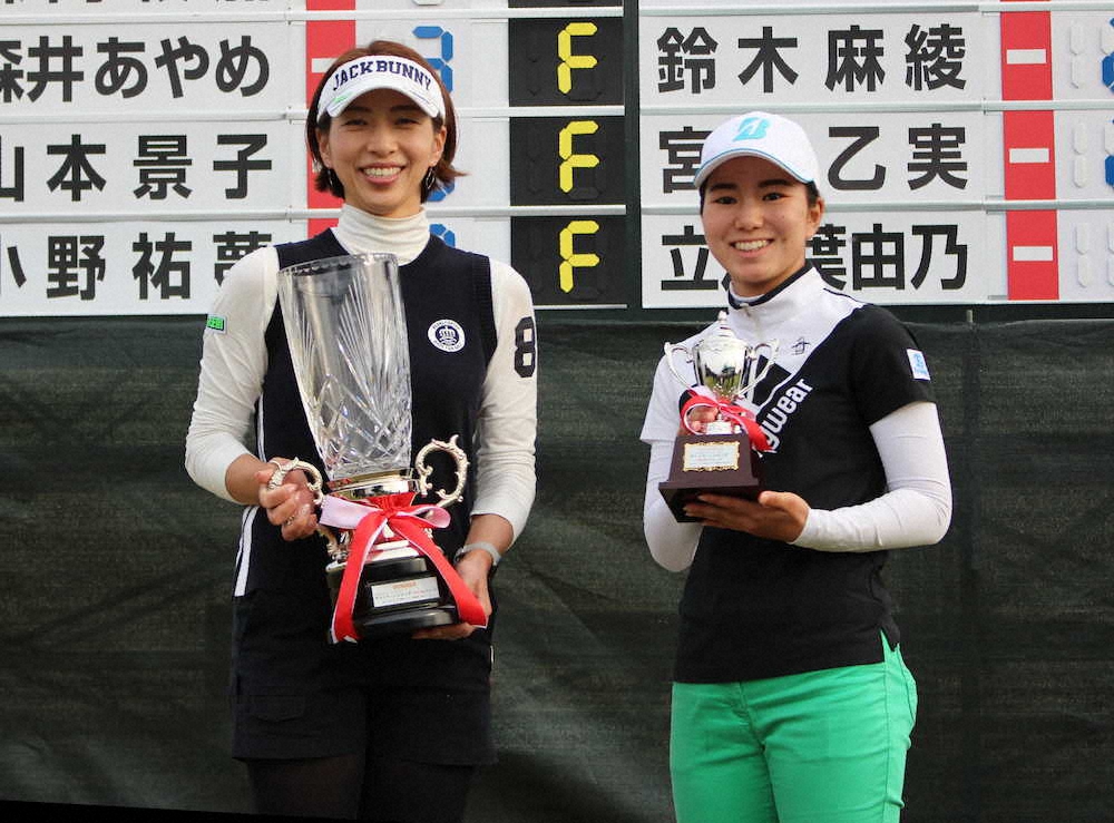 ラシンクニンジニアRKBレディース最終日、優勝した佐藤靖子はベストアマの島袋ひの(右)とカップを手に笑顔