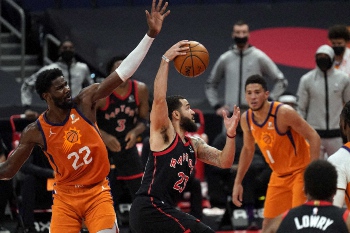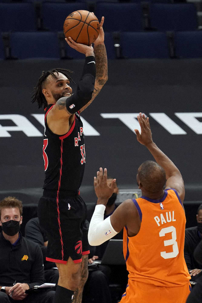 NBA東地区全体で11位に低迷しているラプターズは26日、準本拠地としているフロリダ州タンパで、西地区全体2位につけているサンズと対戦。25日のトレード期限で今季19・6得点を挙げていたノーマン・パウエル(27)をトレイルブレイザーズに放出したが、この日は交換要員で獲得した今季15・0得点のゲイリー・トレントJR(22)を先発させて強敵に立ち向かった。