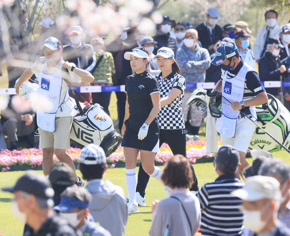 <アクサレディース・初日>1番、ギャラリーが見つめる中、河本結(中央左)と同組でラウンドする渋野日向子(撮影・西尾 大助)