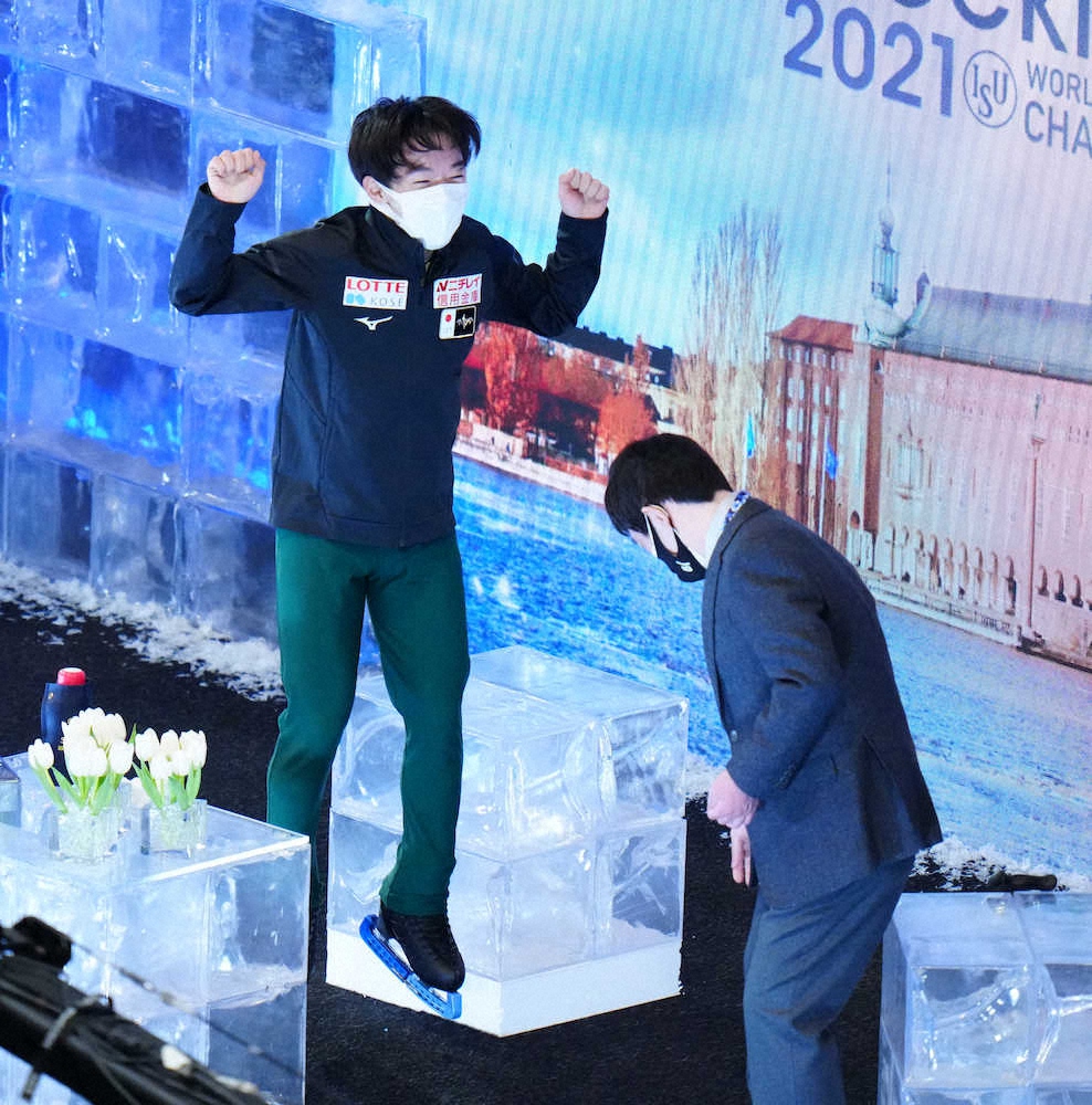 <世界フィギュア第4日>男子フリー、得点を確認し飛び上がって喜ぶ鍵山優真(左)と父・正和コーチ(撮影・小海途 良幹)