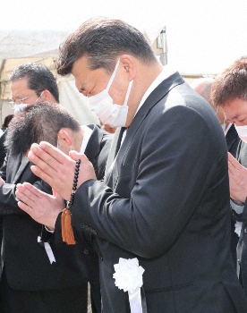古賀稔彦さんの告別式で、手を合わせ古賀さんを見送る吉田秀彦氏(撮影・村上 大輔)