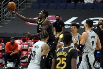 起用された選手は9人で、渡辺雄太(26)は2試合連続で出場機会なし。トレードされずに残留したカイル・ラウリー(35)は右脚を痛めて欠場した。パスカル・シアカム(26)が26得点と8リバウンド、フレッド・バンブリート(27)が20得点と8アシスト、OG・アヌノビー(23)が19得点と10リバウンドを稼いだものの、第3Qで10―23とリズムを失い、球宴明けの後半戦は1勝9敗となった。