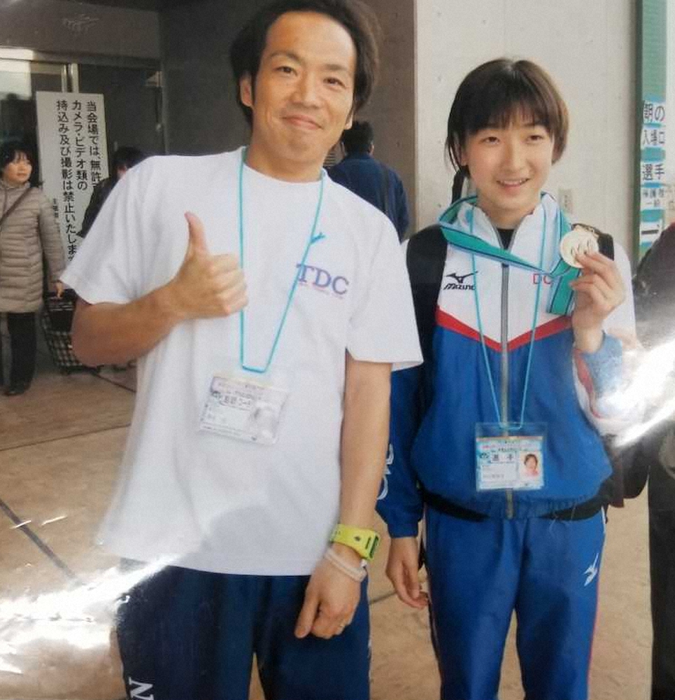 小学生時代の池江(右)と清水桂コーチ