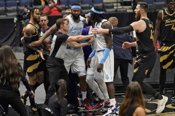 試合は序盤で大荒れ。第1Qの残り2分24秒、速攻からシュートに持ち込もうとしたラプターズの先発フォワード、OG・アヌノビー(23)を背後からレイカーズのガード、デニス・シュルーダー(27)が両手で体を押さえ込み、アヌノビーがシュルーダーの脚を持ち上げて放り投げたことがきっかけとなってコートが不穏な空気に包まれた。
