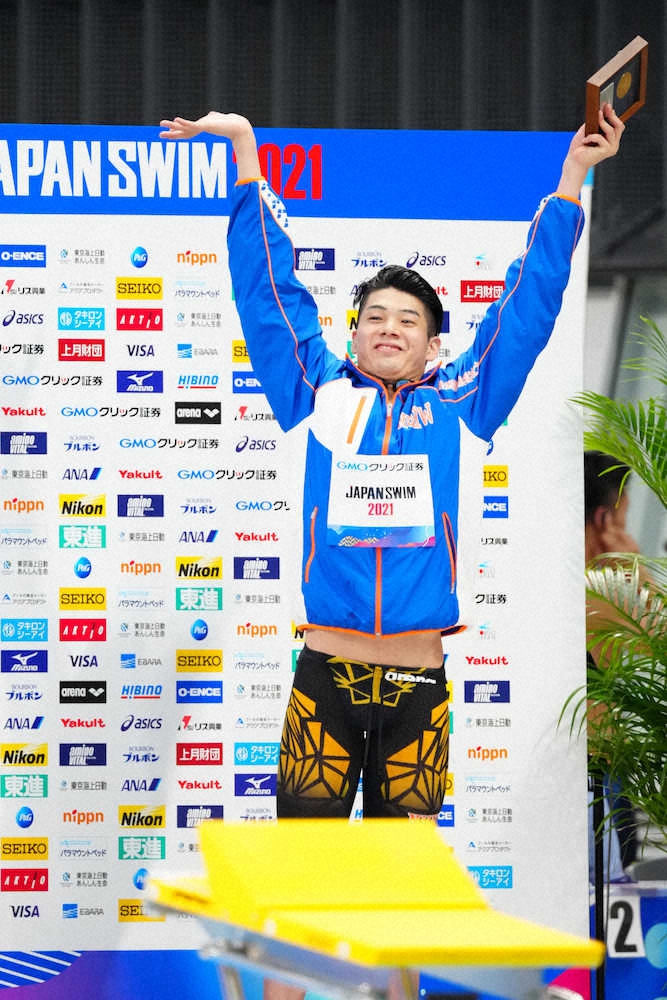 1メートル80の恵まれた体と、30センチの足から繰り出されるドルフィンキックが大きな推進力を生み、最後に川本を逆転した。「全く周りを見てなくて目をつぶって泳いでいる感じ。隣を見てしまうと意識してしまう。とにかく自分のレースに徹するところにぶれずに、目を薄くしてでも自分らしいレースをしようと思った。そこは凄くいい泳ぎができた」。全集中の泳ぎだった。