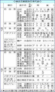 日本水連は11日、競泳の東京五輪代表を発表した。10日までの日本選手権で五輪切符を獲得した29人に加え、リレー要員として塩浦慎理(29=イトマン東進)ら4人を追加し、計33人(男子17、女子16)を選出。コーチ陣も発表され、女子の400メートルリレーと400メートルメドレーリレーで代表入りした池江璃花子(20=ルネサンス)を指導する西崎勇コーチは外れた。