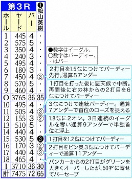 昨年1打差6位から10位に後退した3日目。11番から連続バーディーで首位を捉えた。迎えたパー5の15番はグリーン手前の池を恐れることなく、残り205ヤードを5Iでカット気味に打ち1・8メートルに2オンする。3日連続のイーグルで単独首位。この日の「65」は、01年の伊沢利光と15年の自身がマークした「66」を更新する日本人選手最少ストロークともなった。