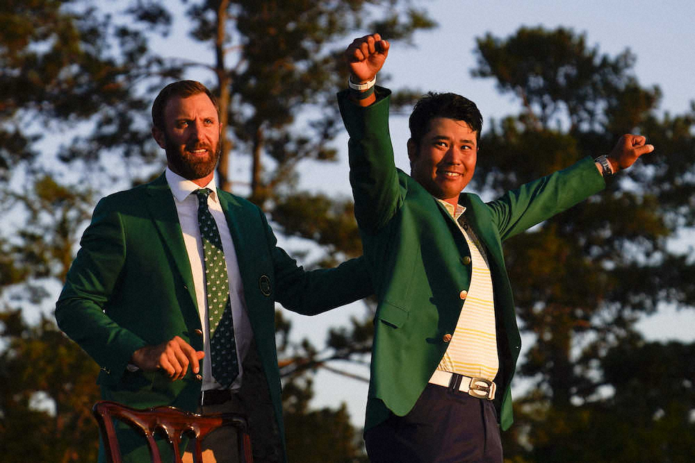 グリーンジャケットにガッツポーズの松山英樹(AP)