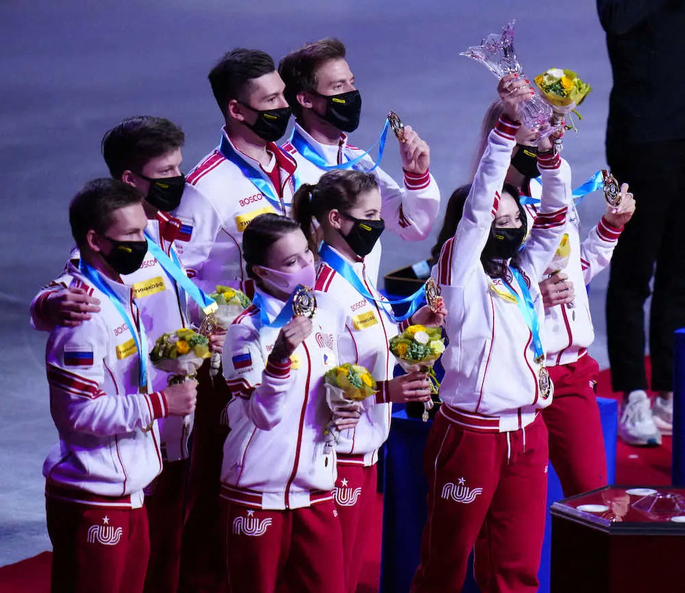 <世界フィギュアスケート国別対抗戦最終日>優勝し喜ぶロシアチームのトゥクタミシェワ(前列右から2人目)、シェルバコワ(同左)=撮影・小海途 良幹