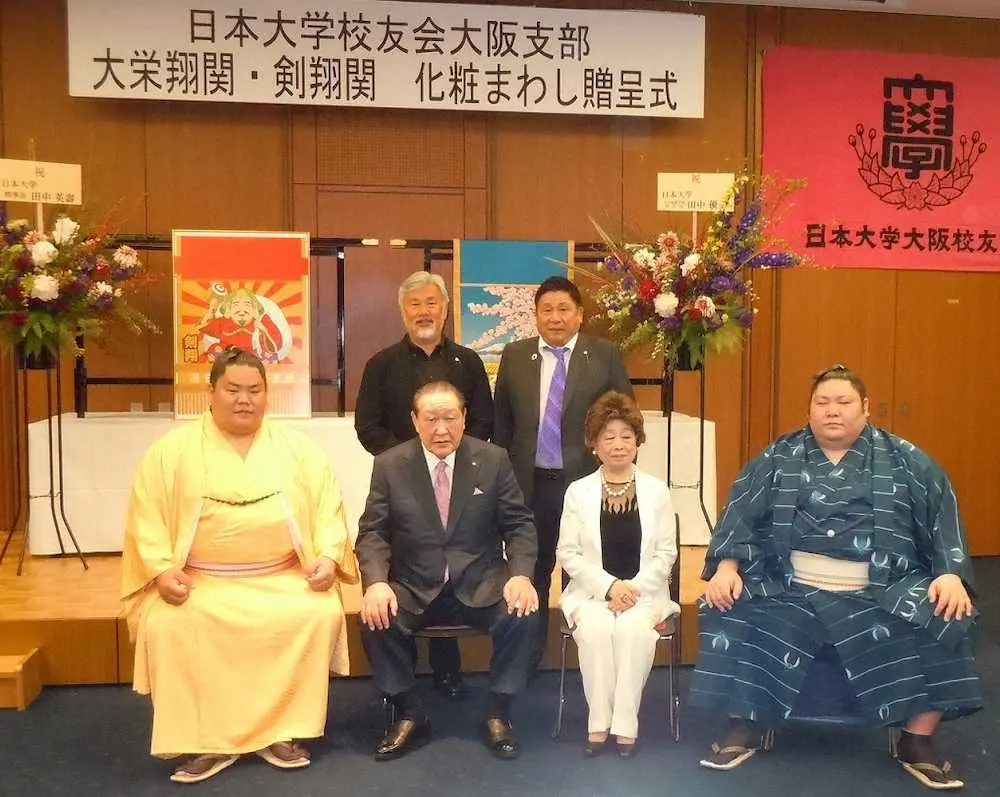 日大の田中英寿理事長は祝辞で「27歳は力が出る時期。大いに期待している」と述べた上で「稽古をしっかりする人が出世する。これが基本」とさらなる奮起を促した。これを聞いた大栄翔は「伝統ある日大の名前が入った化粧まわしをつけるので、自覚を持って臨んでいきたい」と気持ちを新たにした。