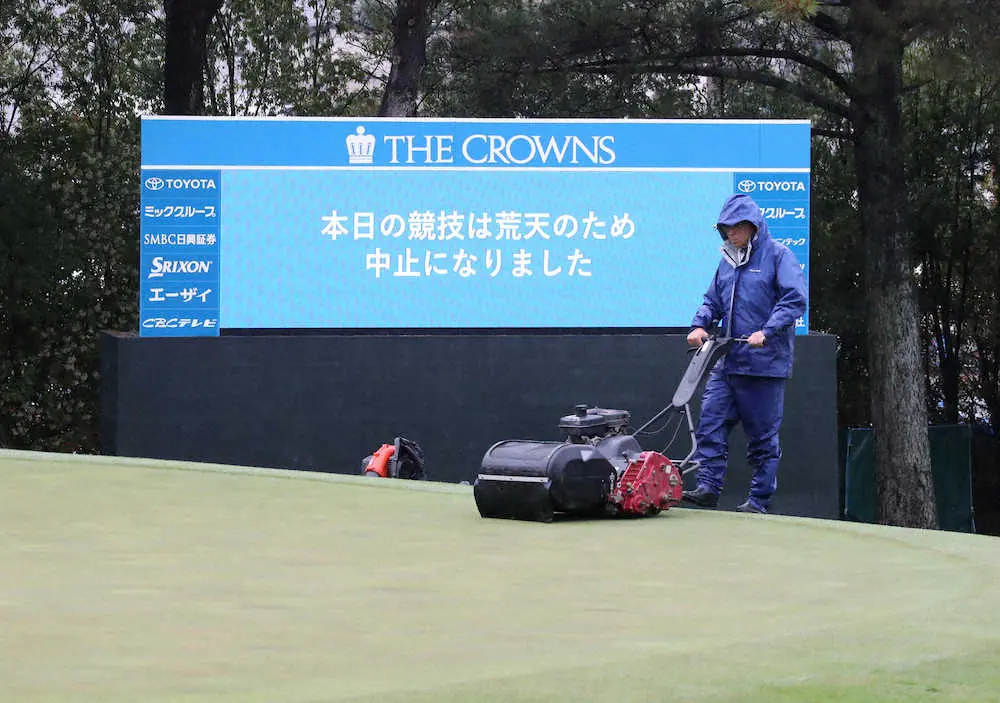 中日クラウンズ、第1日の雨天中止を告げるボードの前で芝を刈る関係者(撮影・井垣 忠夫)