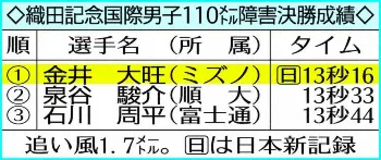 男子110メートル障害決勝で、金井大旺(25=ミズノ)が13秒16(追い風1・7メートル)を出して優勝し、高山峻野が19年に出した従来の日本記録13秒25を0秒09更新した。16年リオデジャネイロ五輪では銀メダルに相当する好記録。東京五輪後に歯科医を目指す秀才ハードラーは、参加標準記録13秒32を突破したどころか、一気にメダル候補に名乗りを上げた。