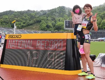 速報タイムは自己タイの12秒97。「もうちょっとだったのに」とこぼした直後、12秒96の公式記録表示を見た寺田は頭の上で手を叩いた。客席へ「おいで!おいで!」と呼び、下りてきた少女をかかえ、日本記録が表示された電光掲示板の前で、一緒に写真に納まった。小1になった長女の果緒ちゃんだ。娘はうれし泣き。「私もうるっときた」とつられて母の目も潤んだ。