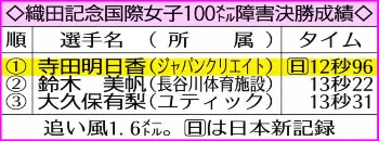 女子100メートル障害決勝は寺田明日香(31=ジャパンクリエイト)が自身の日本記録を0秒01更新する12秒96(追い風1・6メートル)を出して優勝した。