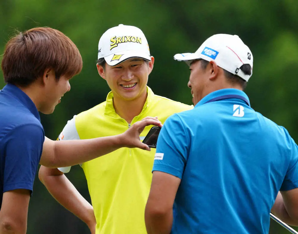 <ダイヤモンドカップゴルフ2021練習日>堀川未来夢(右)と笑顔で練習ラウンドする星野陸也(撮影・沢田 明徳)