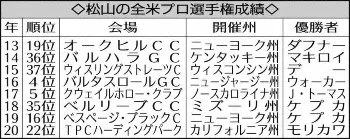▽全米プロ選手権 全米プロゴルフ協会が主催し他のメジャー大会と違いプロのみが出場する。第1回は1916年に開催。当初はマッチプレーで58年からストロークプレー。会場は毎年変わる。優勝者は同協会の創設者の名を冠したワナメーカー・トロフィーを授与され、5年シードが付与される。松山は今回が9年連続9回目の出場で16年の4位が過去最高成績。