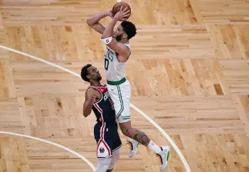 ウィザーズのロペスをかわしてシュートに持ち込むセルティクスのテータム(AP)