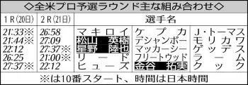▽全米プロ選手権 全米プロゴルフ協会が主催し他のメジャー大会と違いプロのみが出場する。第1回は1916年に開催。当初はマッチプレー形式で58年からストロークプレー形式に変更。会場は毎年変更される。優勝者は同協会の創設者の名を冠したワナメーカー・トロフィーを授与され、5年シードが付与される。松山は今回が9年連続9回目の出場で16年の4位が過去最高成績。