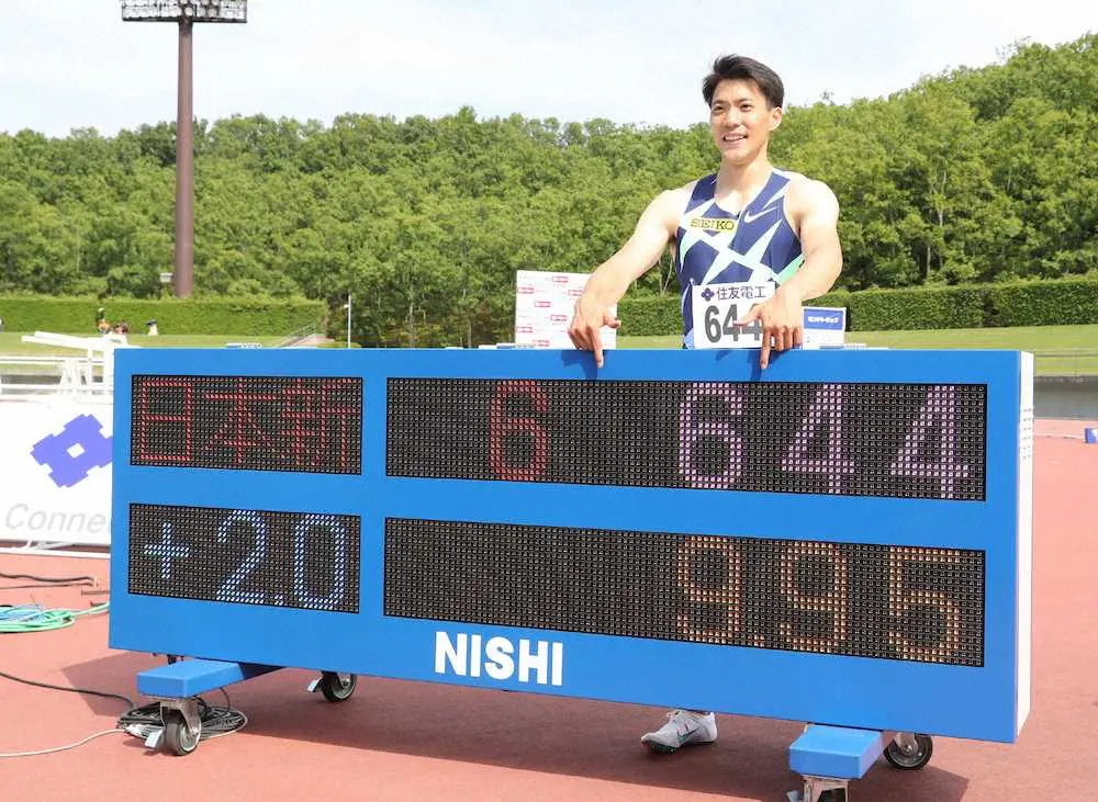 男子100メートル決勝、9秒95の日本新記録で優勝した山県亮太