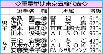 女子55キロ級の八木も開催国枠で代表に決まった。12年ロンドン12位、16年リオ6位に続いて3大会連続の出場。「リオ以降、苦しい時期もあったけど、たくさんの方のおかげでここまで頑張ることができた」と話した。過去2大会は53キロ級だったが、階級変更によって、よりハイレベルな争いとなる。「とても厳しい戦いになる」とし、「1つでもいい順位を狙いたい」と意気込んだ。