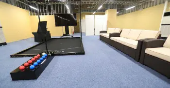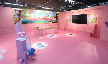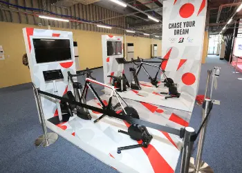 《映える一枚撮れちゃう!?》カジュアルダイニング、フィットネスセンター、診療所などのほかに、選手のレクリエーションエリアも準備された複合施設。派手なピンク色の写真撮影スポットでは“映える一枚”が撮れる。QRコードを読み込んで写真を取り込むと、自転車に乗っているような画像や動画が完成する。